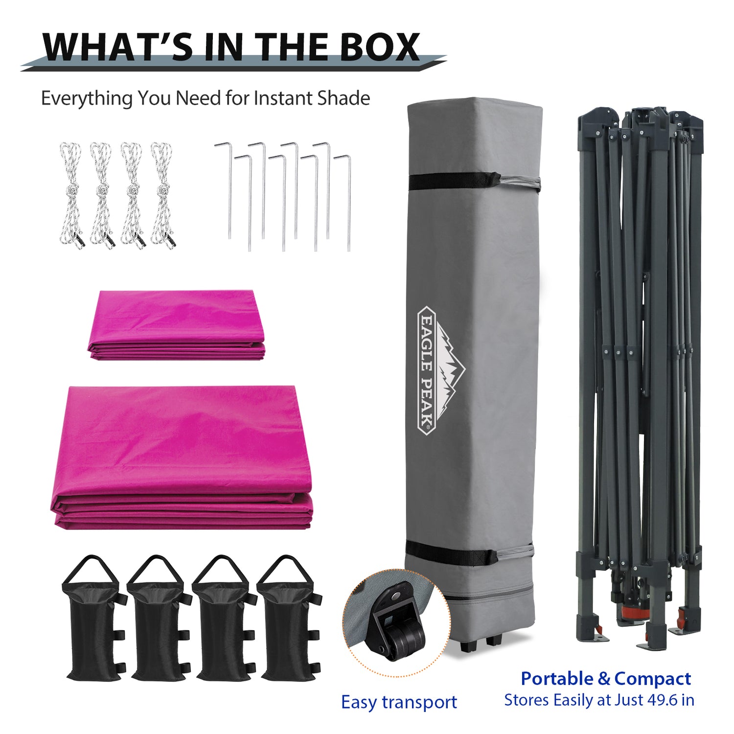 EASY SETUP: This easy setup pop up canopy tent features the Peak Push system, a patented canopy center lock. The portable canopy requires no tools and easily opens and closes from the center in seconds. Its unique canopy tent center lock enables a quick, one person setup, letting you maximize outdoor time with minimal effort.
