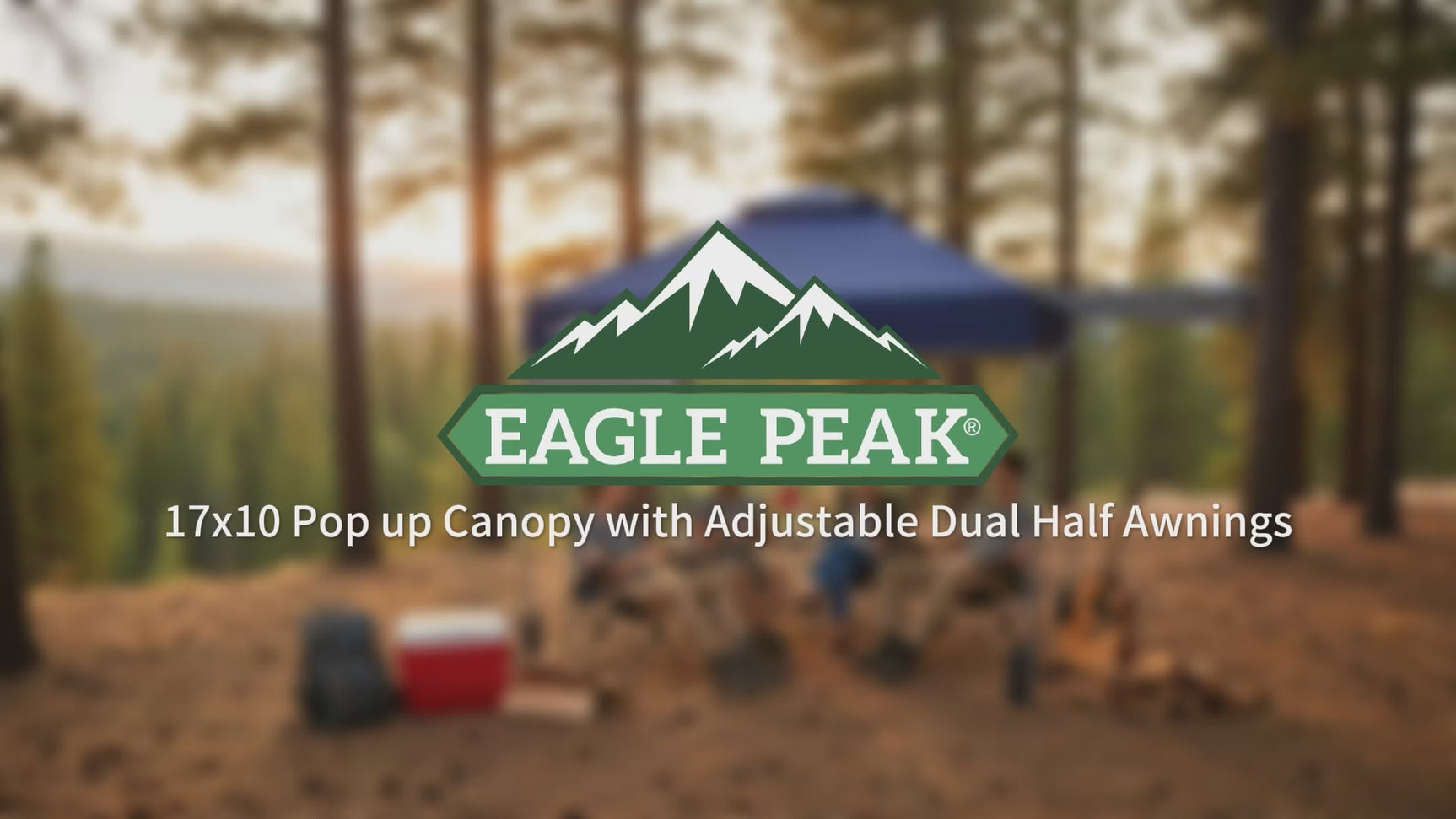 UNIQUE DUAL AWNING DESIGN: The straight leg instant canopy has two adjustable dual half awnings whose height can be adjusted to your liking. The 10x17ft dual awning canopy provides maximum coverage so 10-15 people can enjoy 170 square feet of shade under our EAGLE PEAK VENT canopy top keeping you cool while you work or relax.