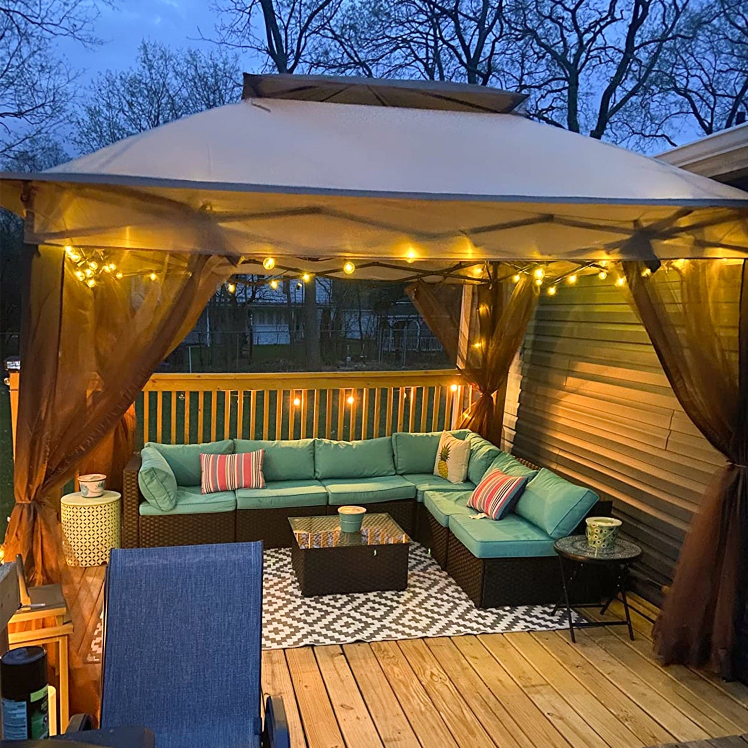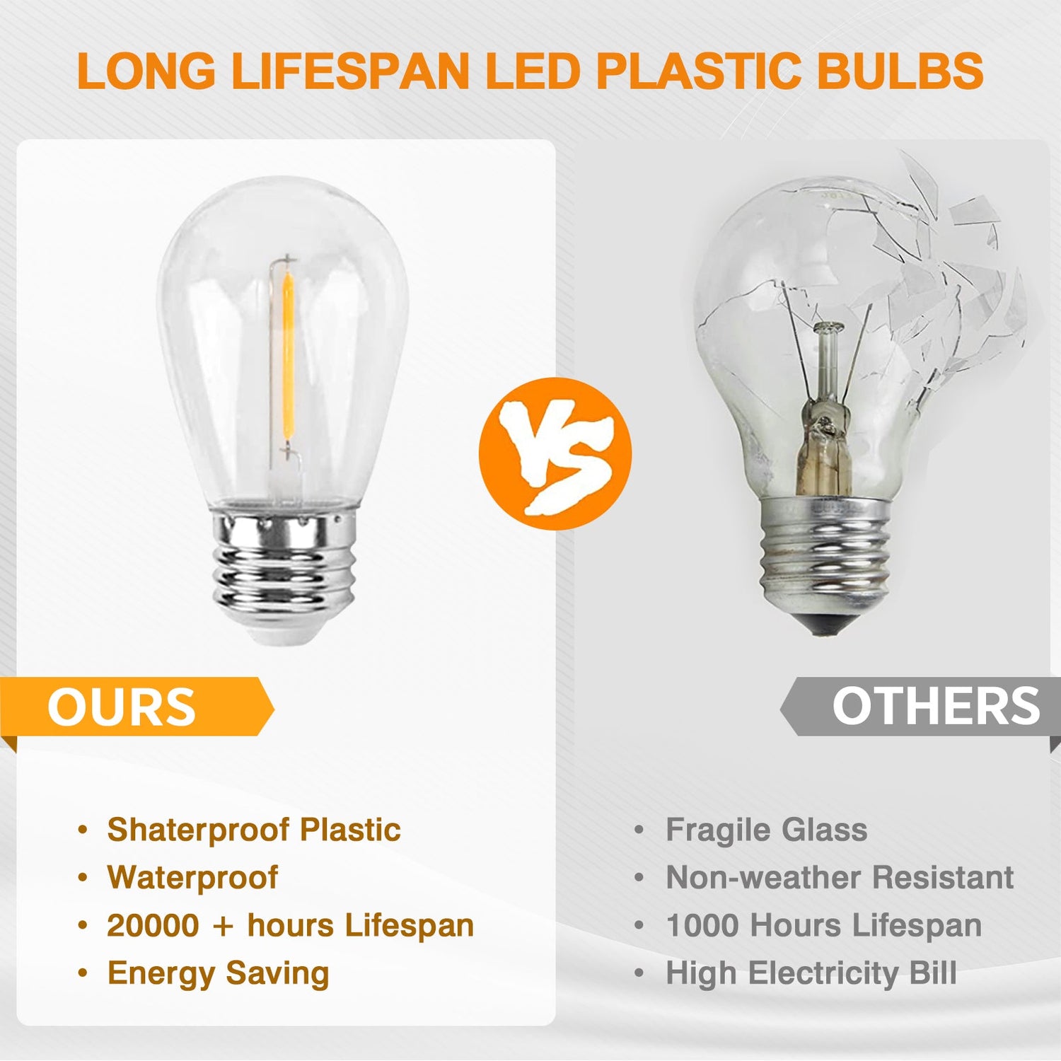 CREATES ENCHANTING AMBIENCE –25 feet long string with 10 clear S14 bulbs (2 spare), end to end connectable. They are crafted from durable plastic and are perfect for enhancing the atmosphere to backyard, garden, deck, pergola or gazebo, providing a warm and joyful vibe for your guests.