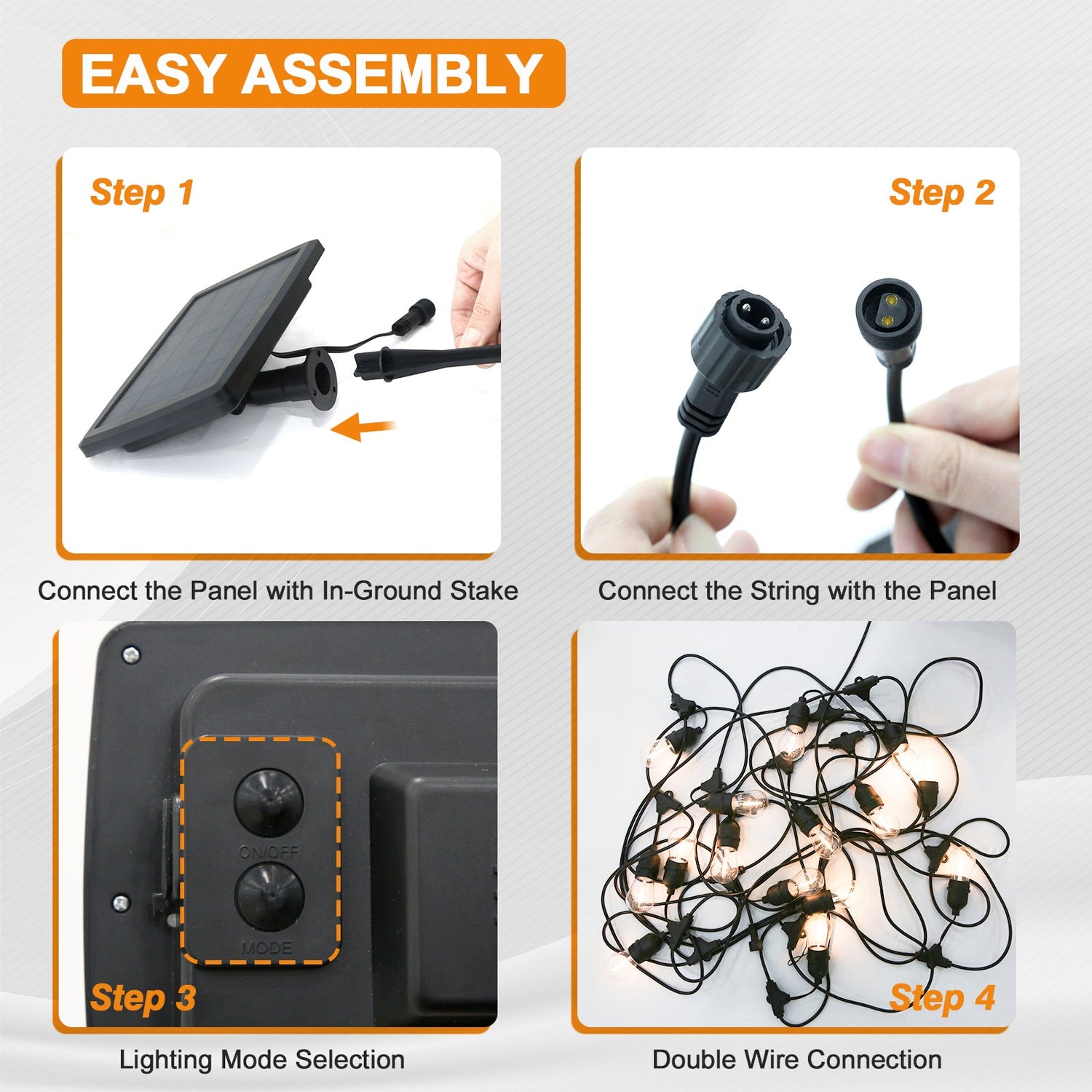 BUILT TO LAST - These weatherproof solar Edison string lights are made to withstand harsh weather conditions with an IP65 waterproof rating and durable black strand. They should be screwed tightly to prevent water from entering the joints between two strands of solar outdoor lights string.