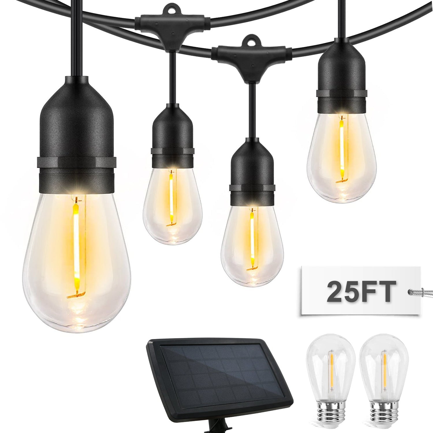 25 FT S14 Solar-Powered String Lights, IP65, 10 Shatterproof Edison Vintage Bulbs (2 Spare)