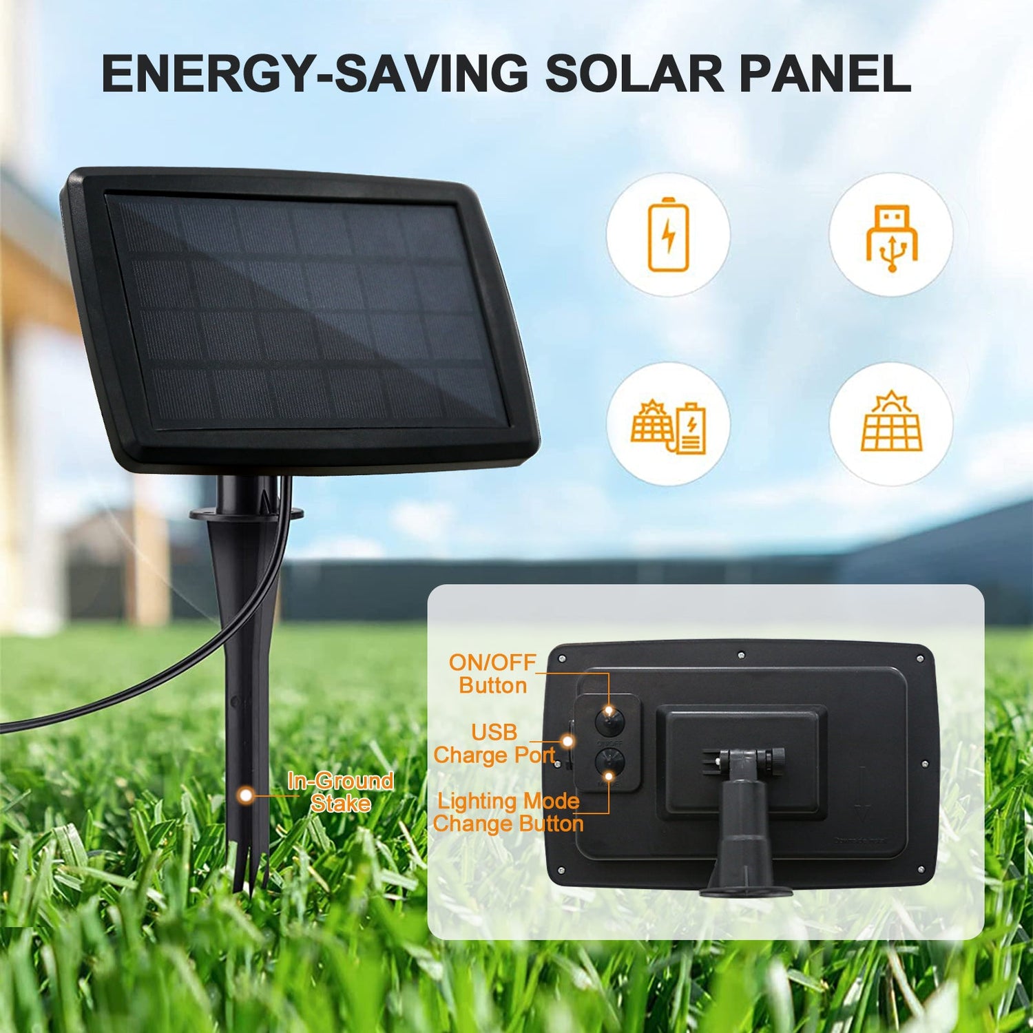 LONG WORKING TIME - The 3W 5.5V solar panel has a 3.7V 4400 mAh battery capacity with 500 charging cycles to provide up to 8 hours of illumination after 8 hours of charging in sunlight. It provides 90% energy savings compared to other outdoor string lights.