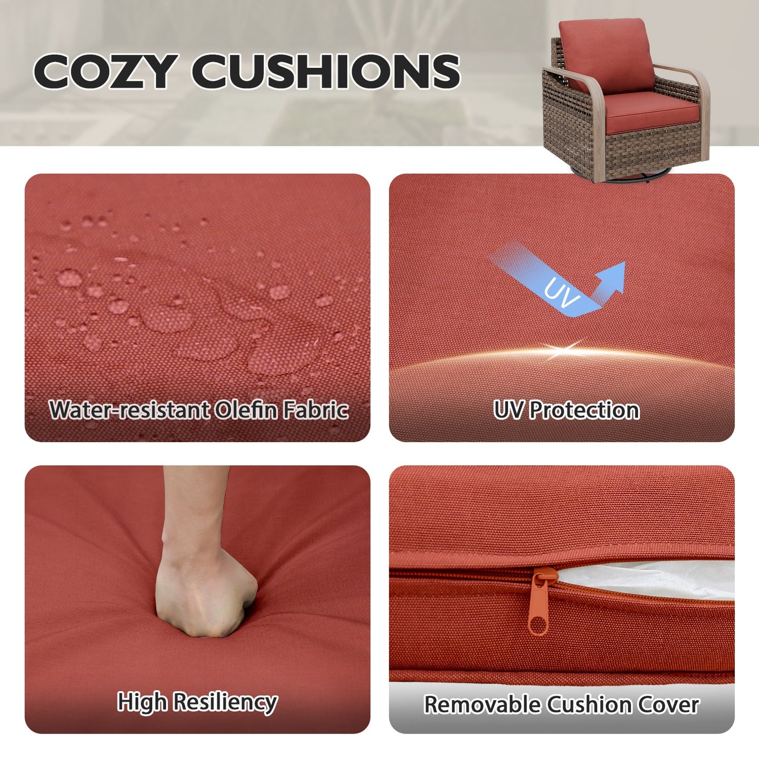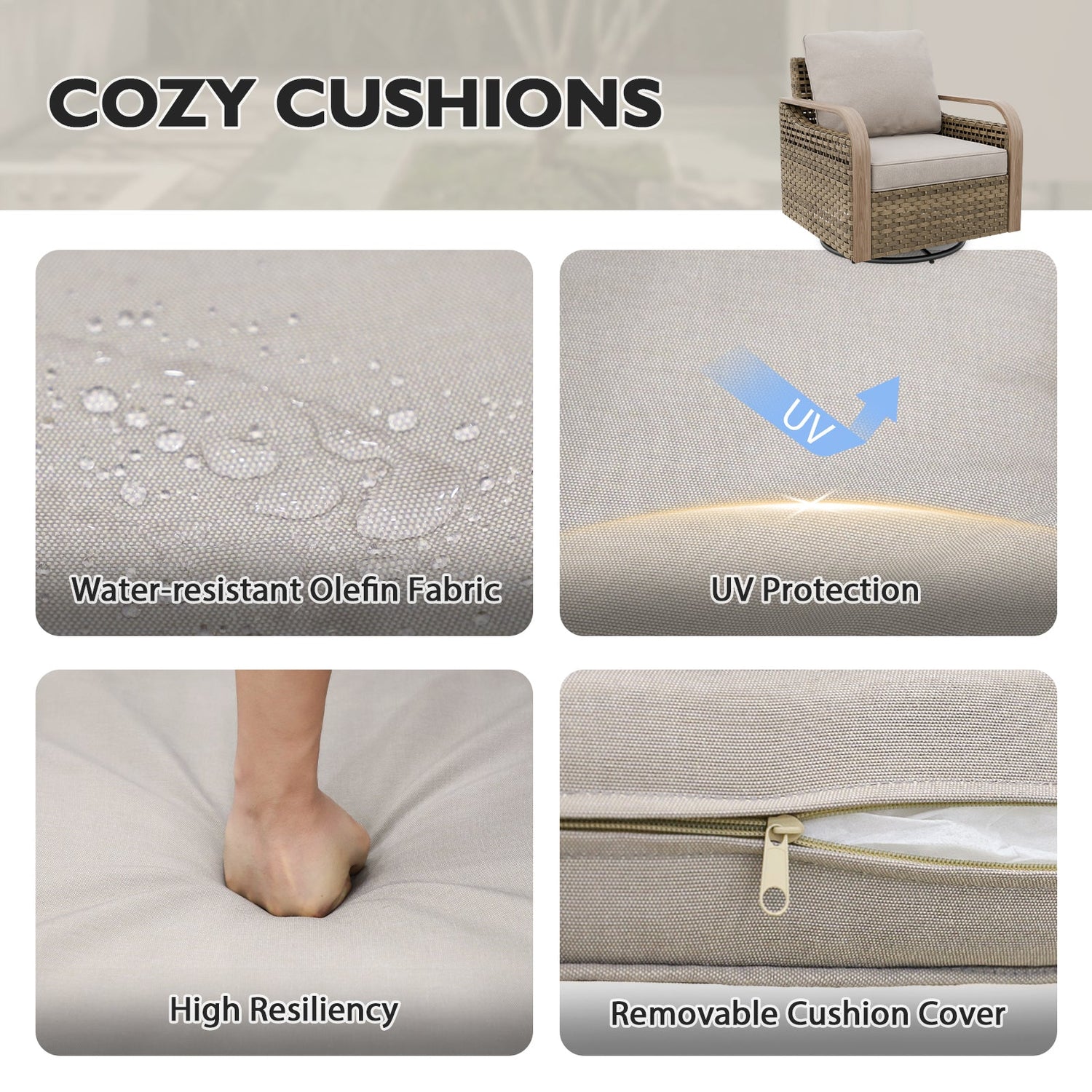 GATHER, RELAX, ENJOY: This wicker swivel rocking chairs have generously widened seats and plush 5-inch back cushions for ultimate comfort. Designed for outdoor living, it's made with UV protection and weather resistance materials, making this furniture the ideal choice for stylish, worry-free lounging.