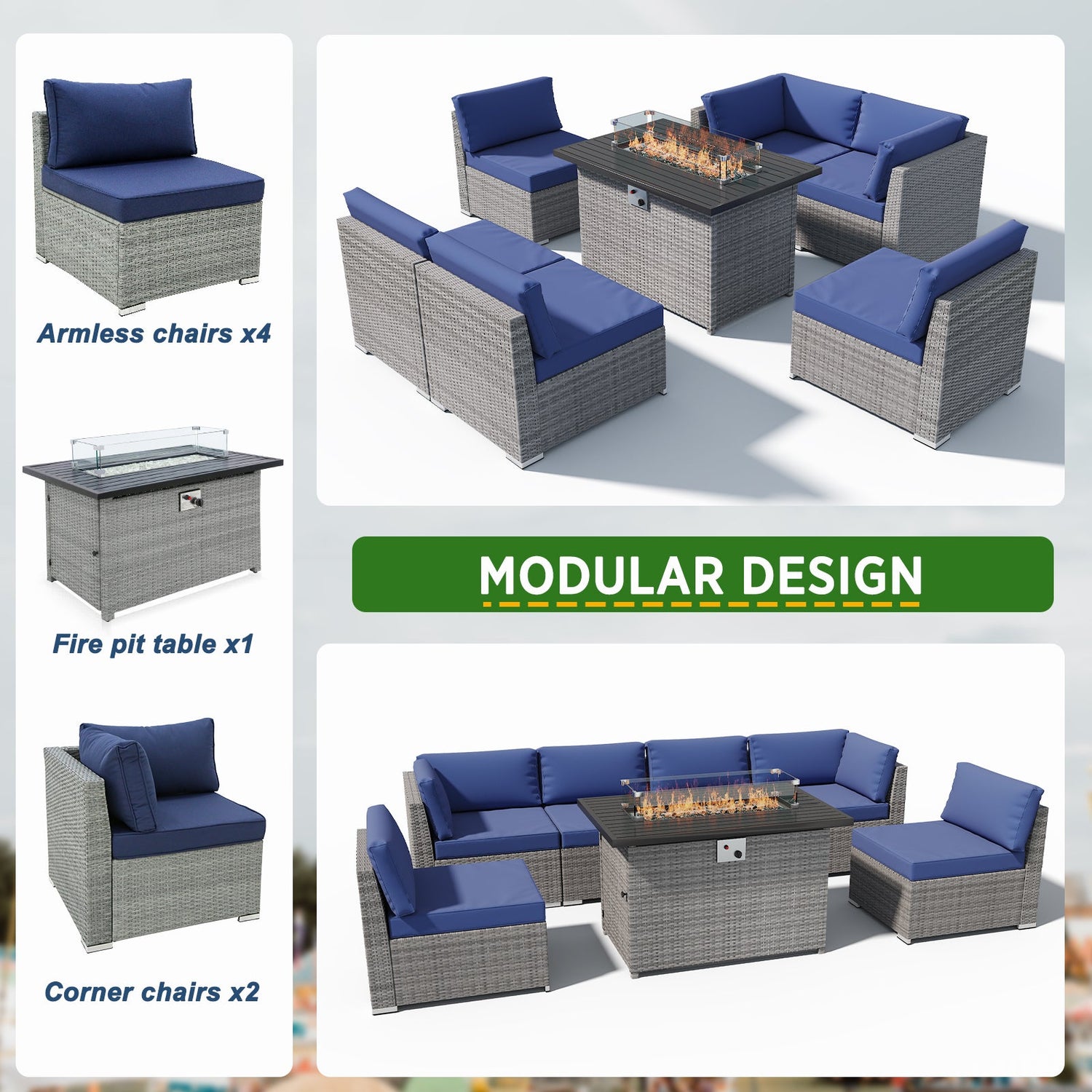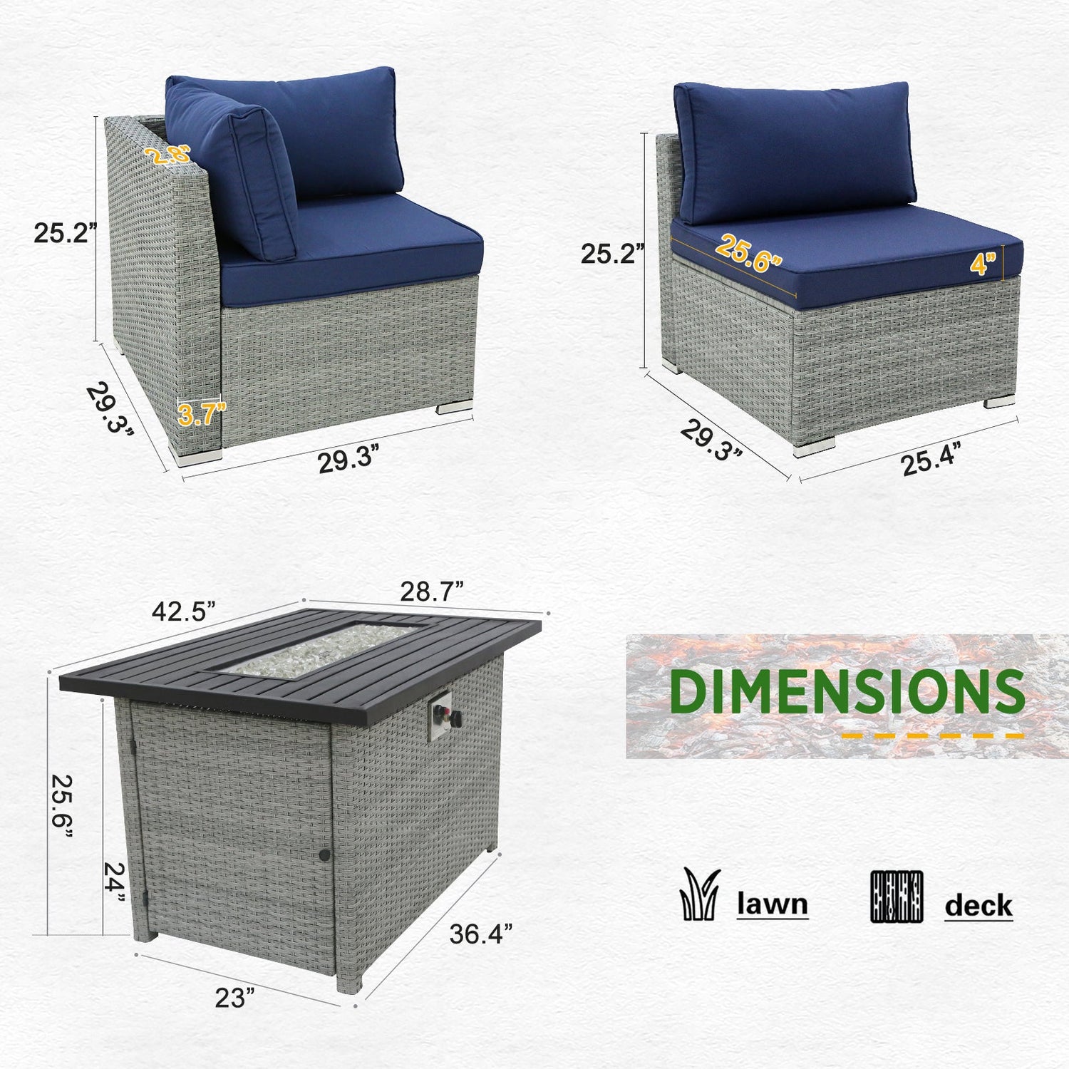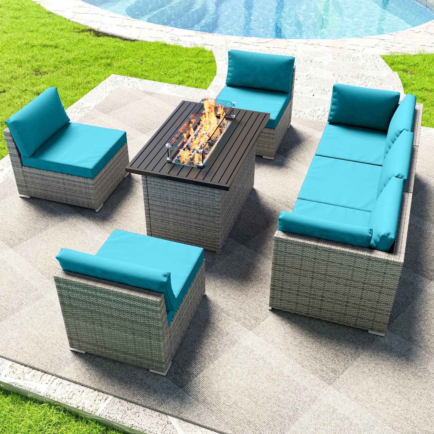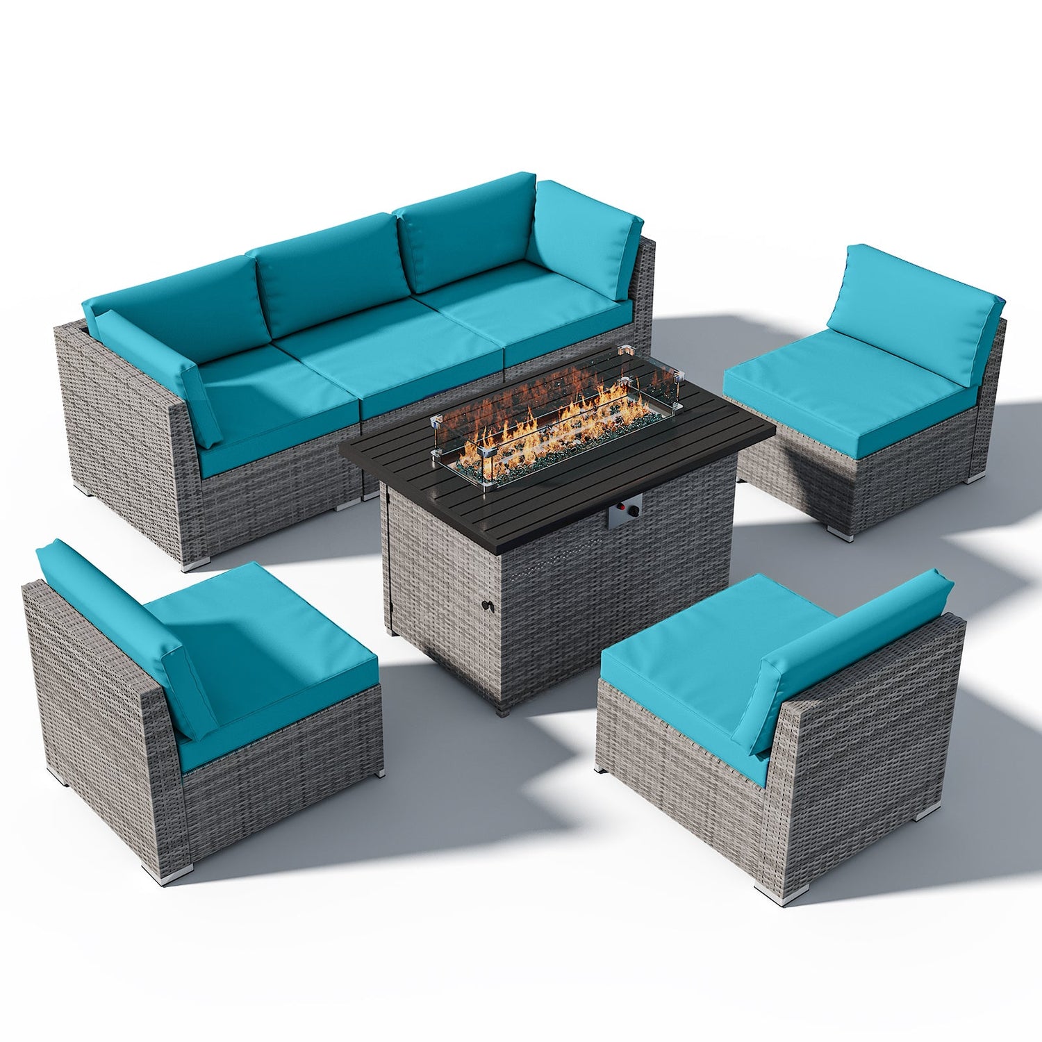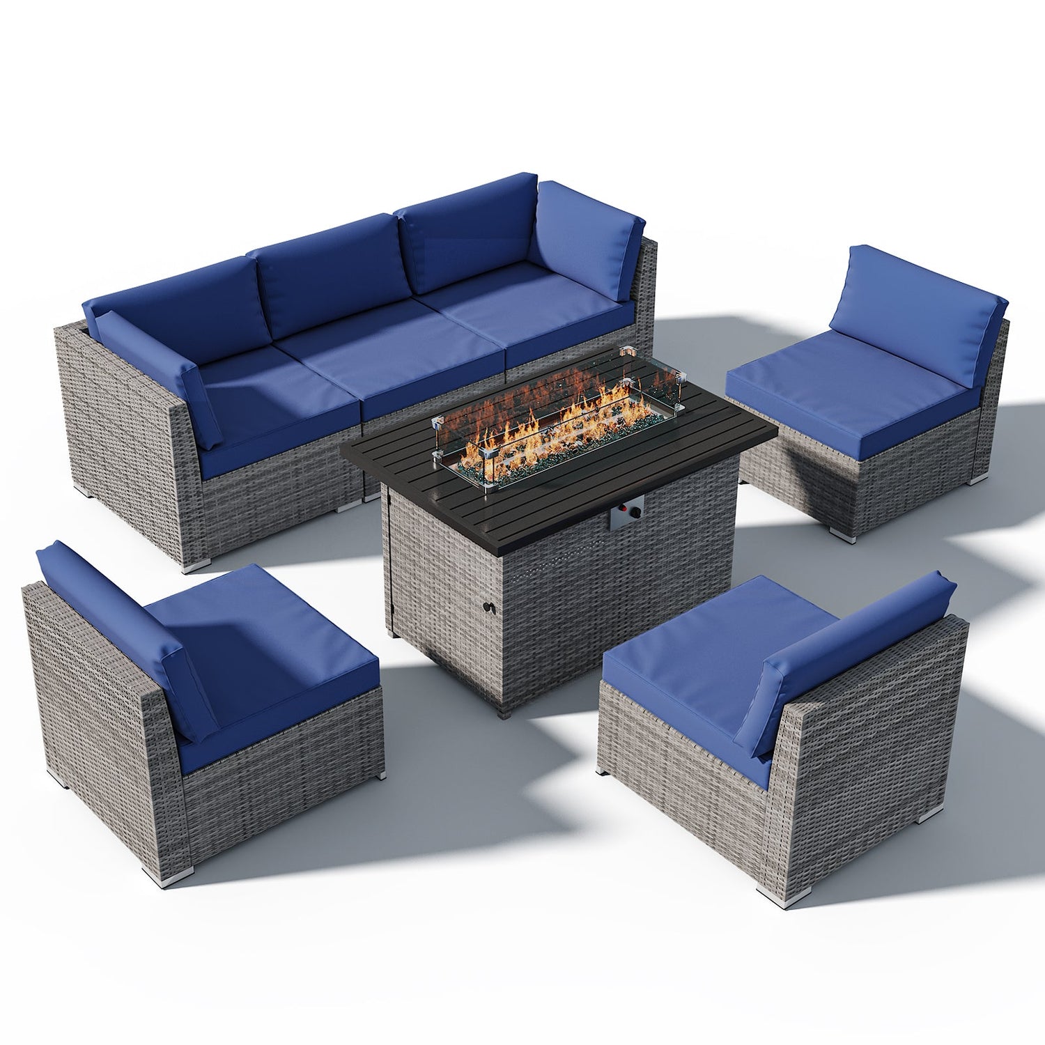7 Piece Outdoor Wicker Patio Furniture Set with Fire Table for 6 People - Dark Blue is backordered and will ship as soon as it is back in stock.