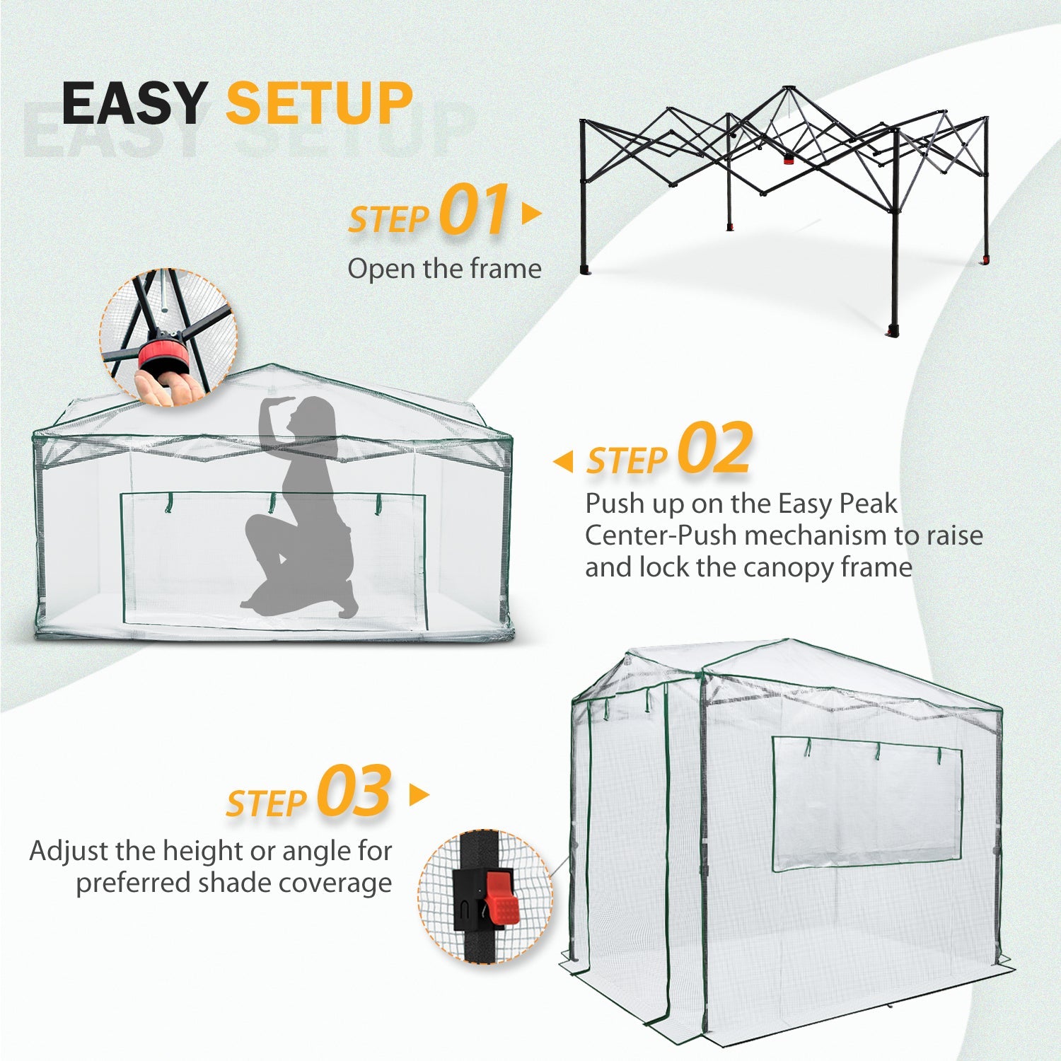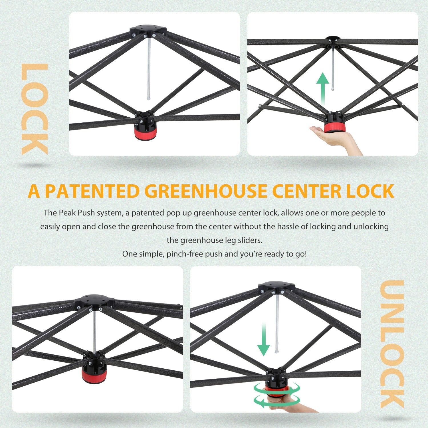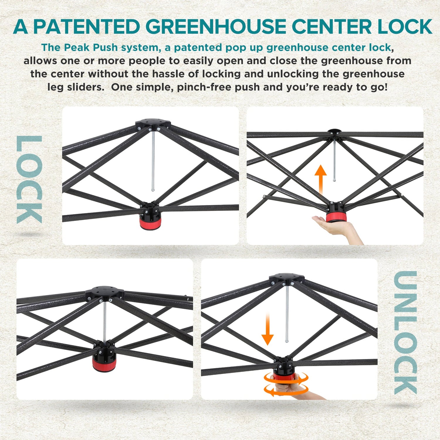 EASY SETUP: This easy setup pop up greenhouse plant tent features the Peak Push system, a patented greenhouse center lock. The portable greenhouse requires no tools and easily opens and closes from the center in seconds. Its unique greenhouse center lock enables a quick, one person setup, letting you maximize gardening with minimal effort.