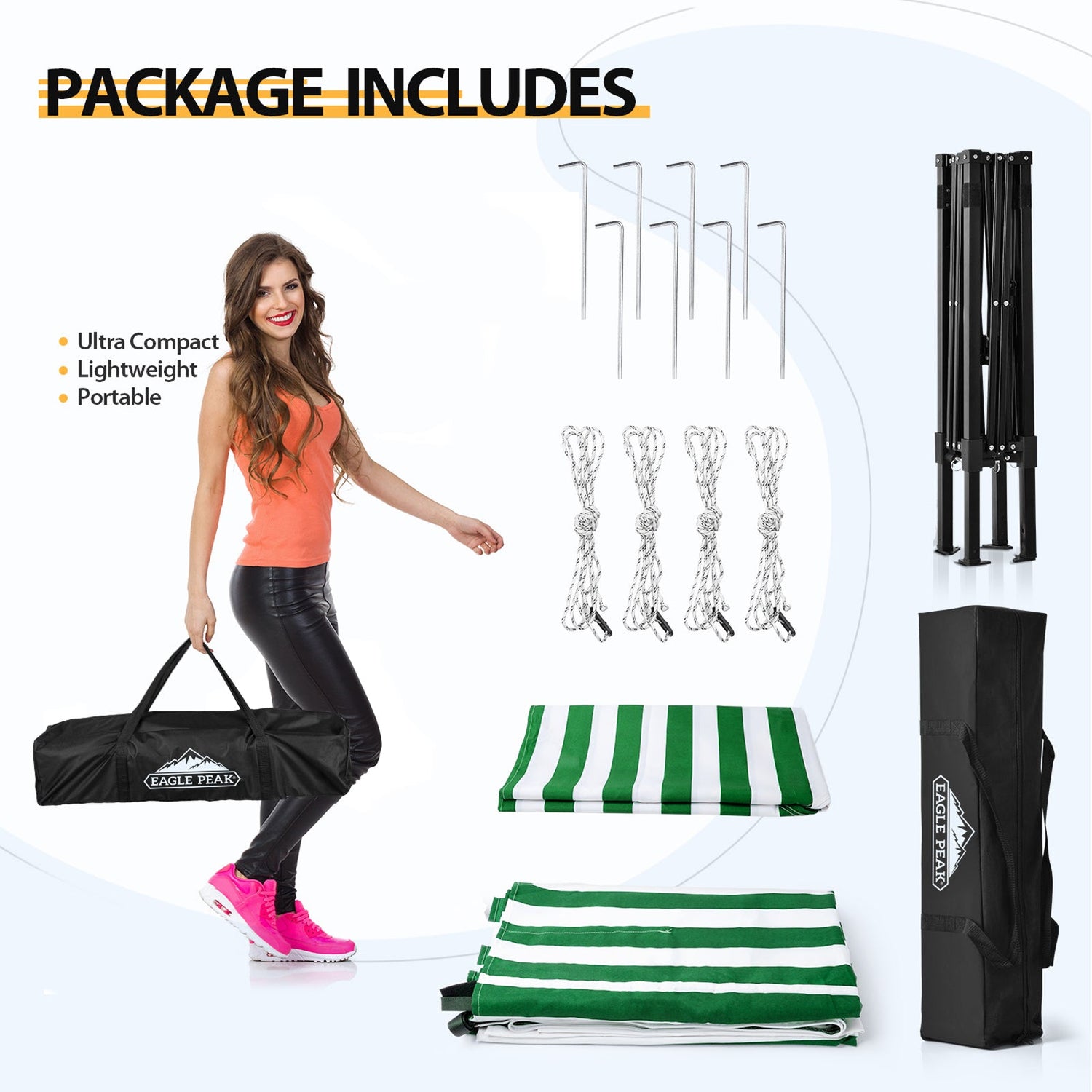 WHAT’S INCLUDED: Canopy Frame, 140g polyester top fabric, sidewalls with easy-entrance zipper for complete enclosure, 2 hooks to hang clothes, towels etc, a mesh storage pocket, carry bag, and 4 additional storage pockets in the lower corners for weights.