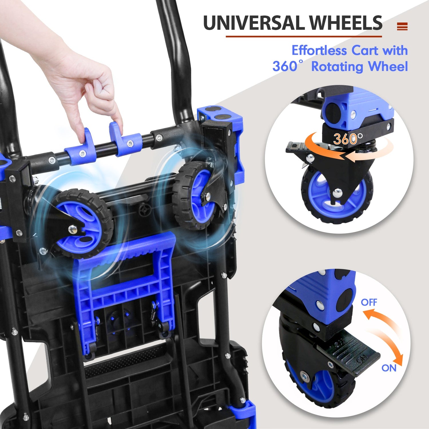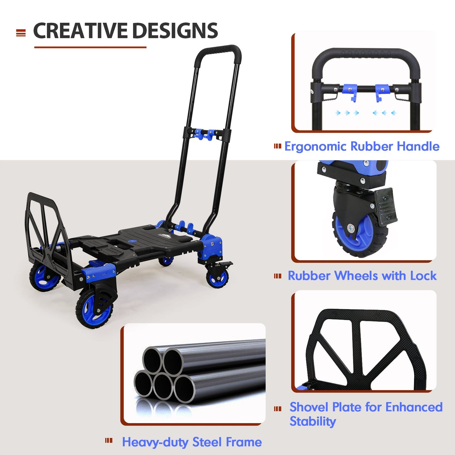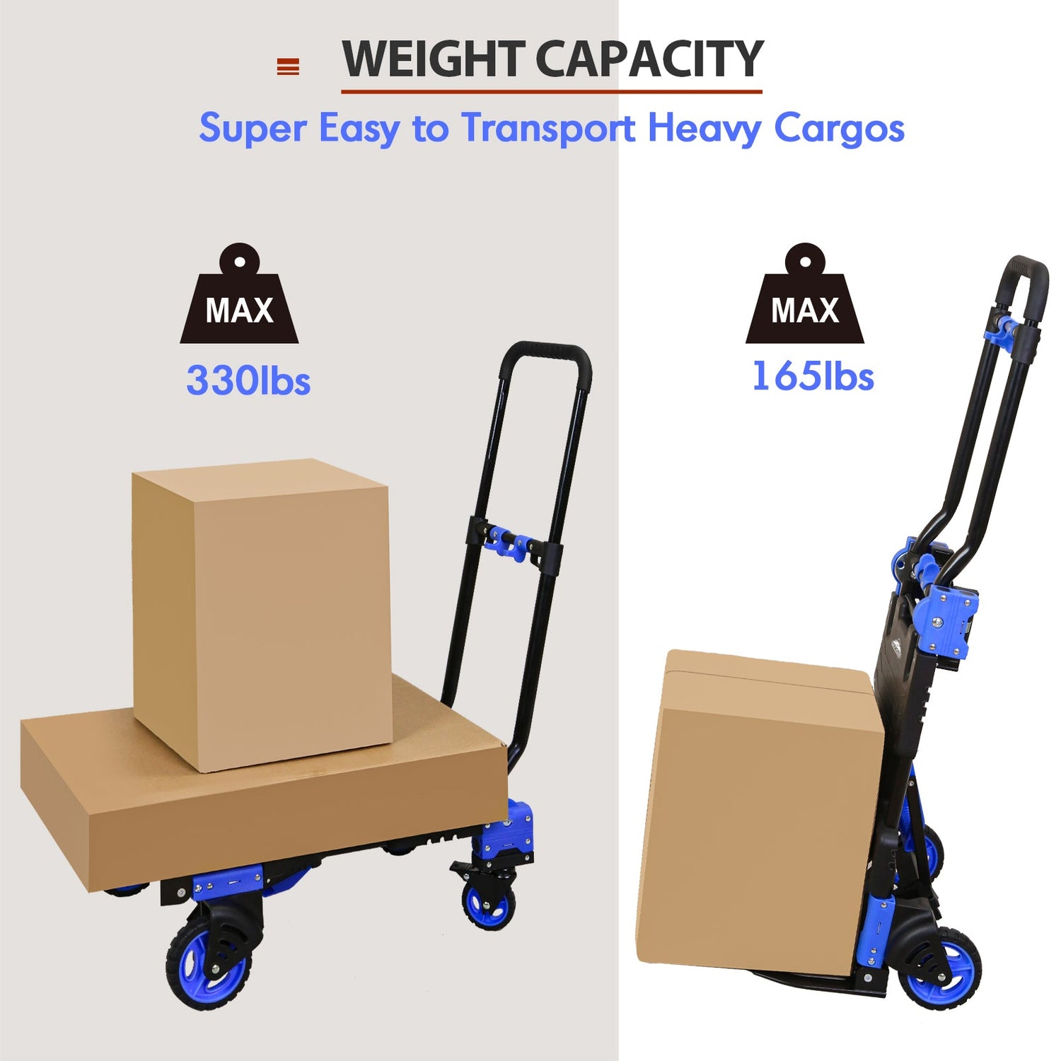 - Heavy Duty Dolly: The hand truck is made of a durable steel and polypropylene material frame structure. 4-wheel cart weight capacity is 330lbs and 2-wheel hand truck weight capacity is 165lbs.