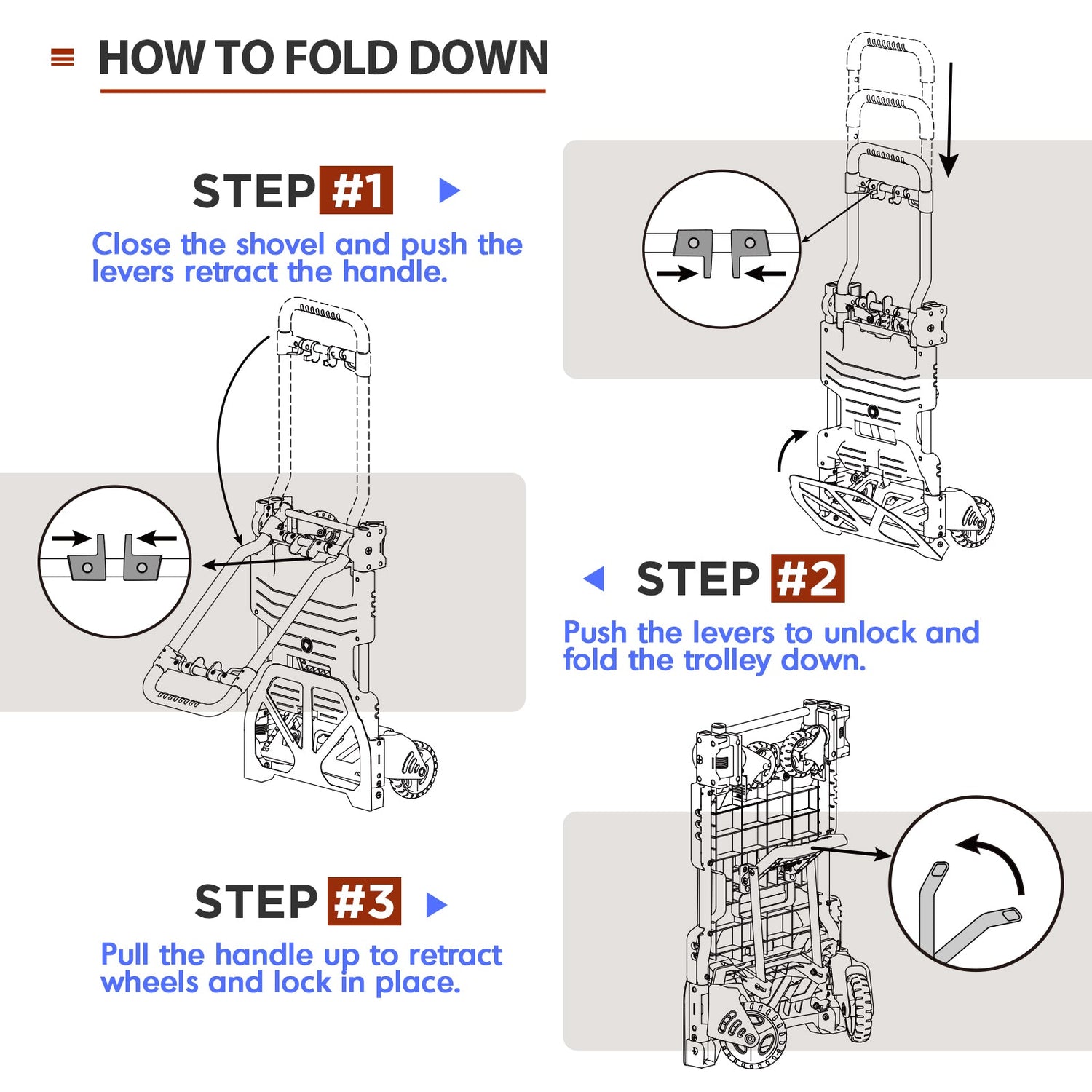 - Adjustable Retractable and Folding Handle: Designed with a retractable handle for different height needs. Single lever design makes the wheels fold in and out, making the cart flat and effortless to store. Folds compactly to 24'' x 14'' x 4.5'', to easily keep in your car trunk, closet, or garage.