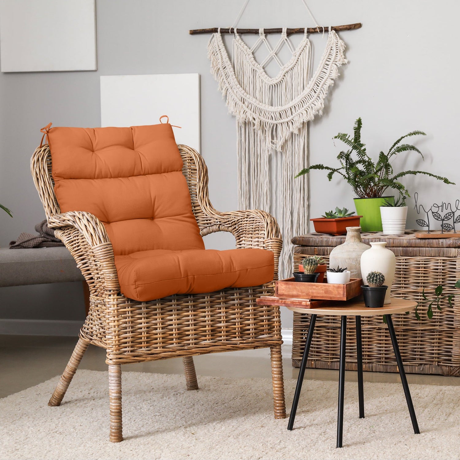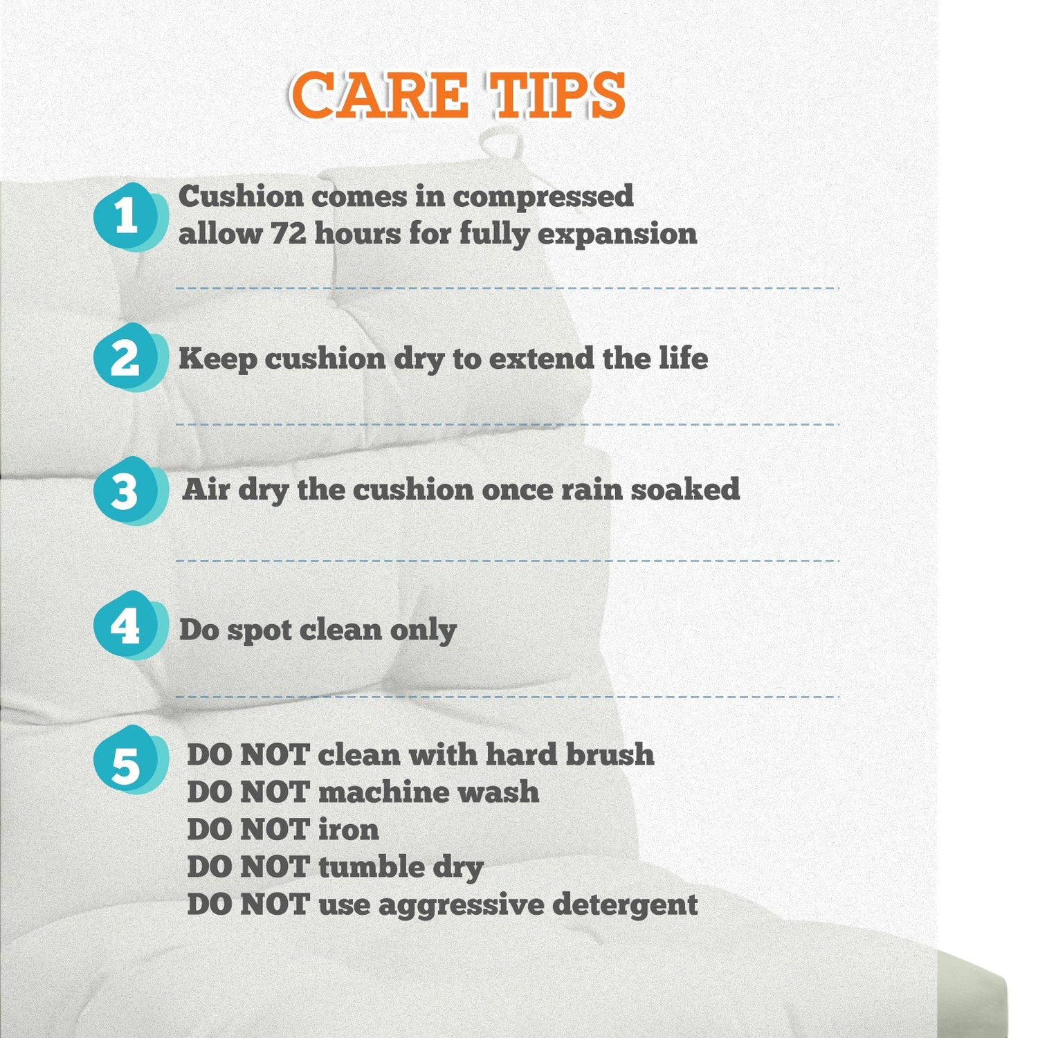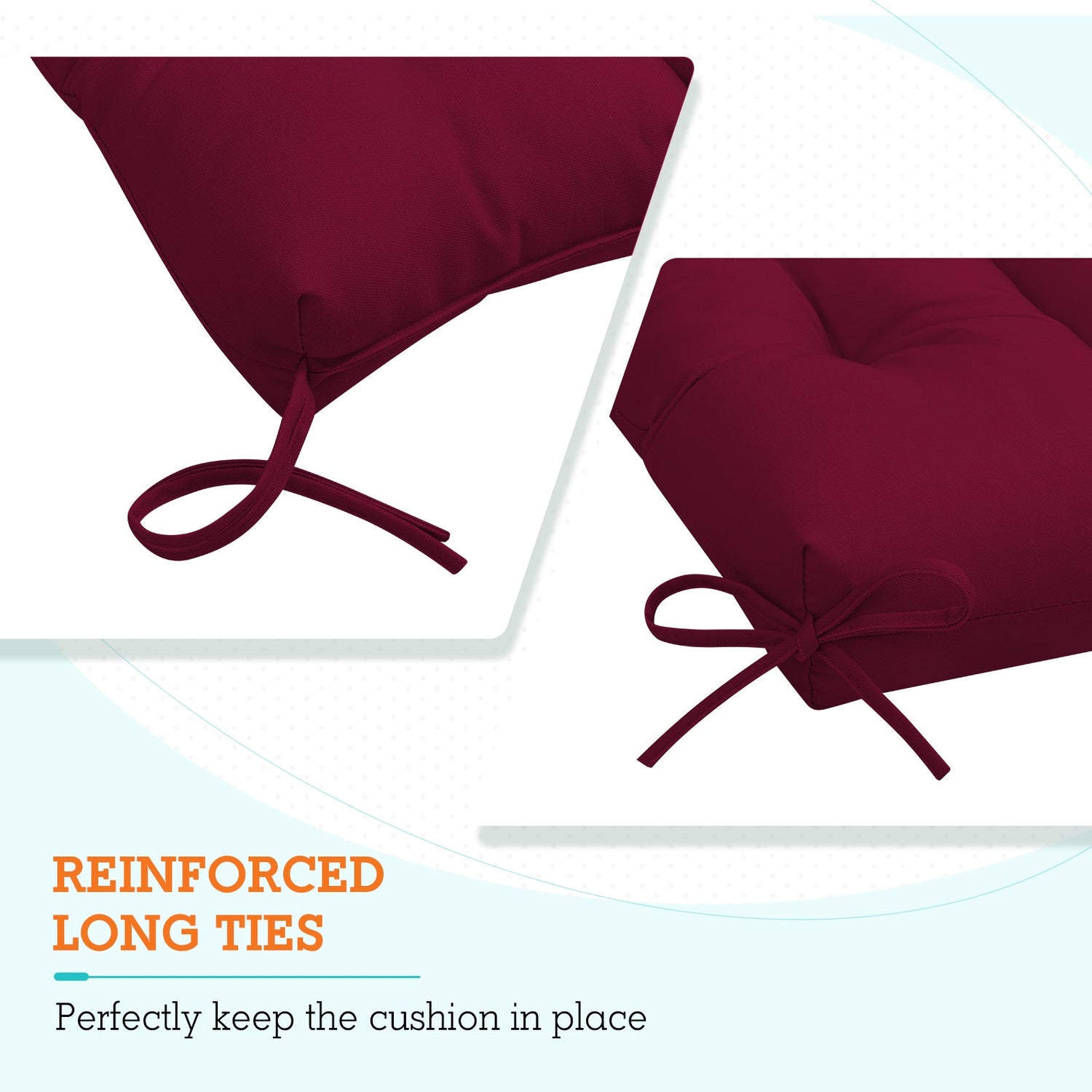 REINFORCED TIES: Features four long ties that help keep the cushion safely attached to furniture and keep the cushion in place. It is recommended to store or cover it when not in use to maintain the product.