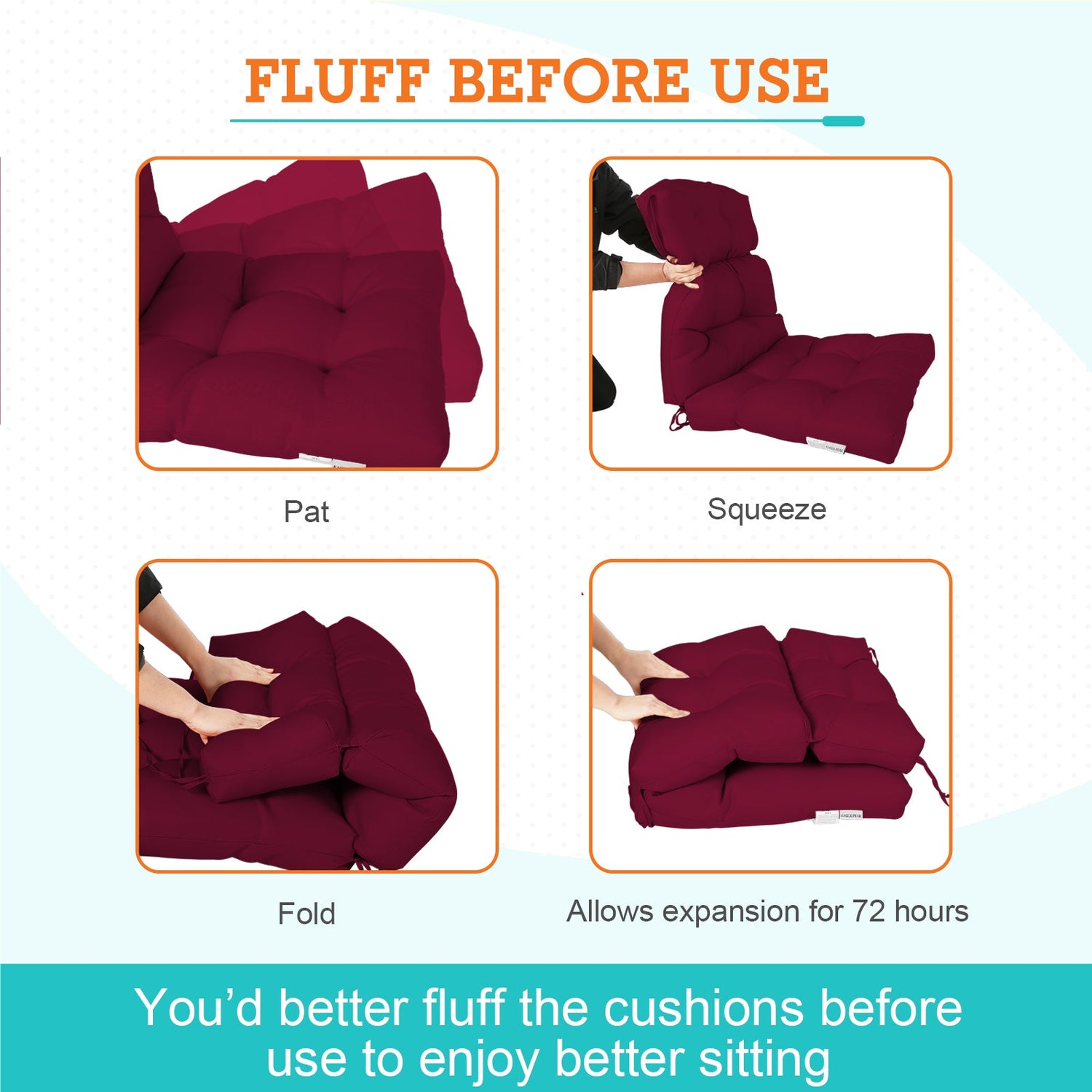 MEASUREMENTS: Please check the size if match your chair first. The seat part measures L 22" x W 22" x thick 4", back part measures L 24" x W 22" x thick 4". Allow up to 72 hours for fully expansion. The cushions are reversible and easy to clean. Lightly dab the fabric with mild soap and warm water, then air dry.