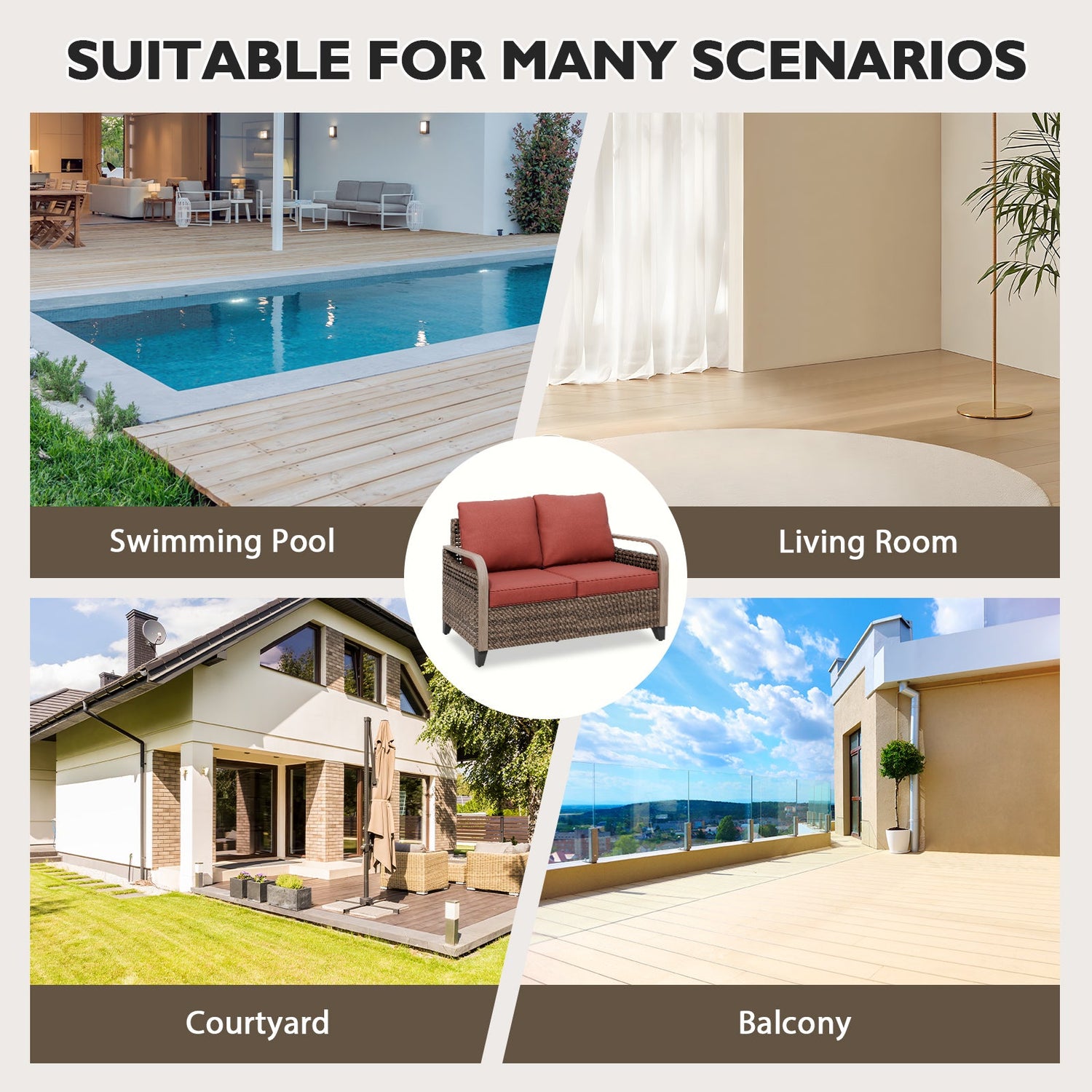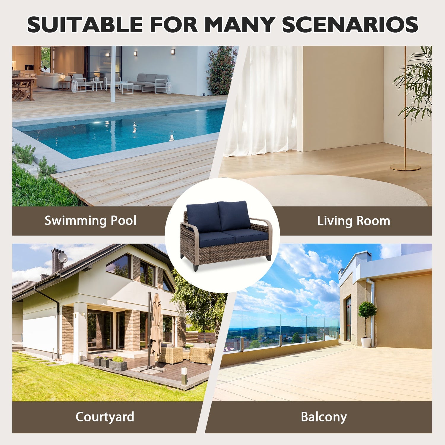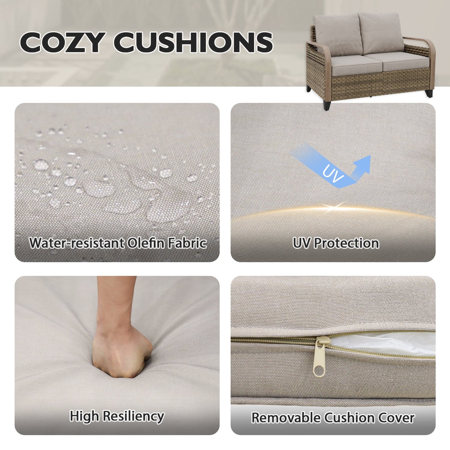 HAND-WOVEN RATTAN: Our outdoor 2 seat sofa is constructed with durable resin wicker, handcrafted over a powder-coated steel frame. Unlike natural wicker, which can dry out and crack, resin wicker is flexible and resistant to fading, ensuring its lasting durability season after season.