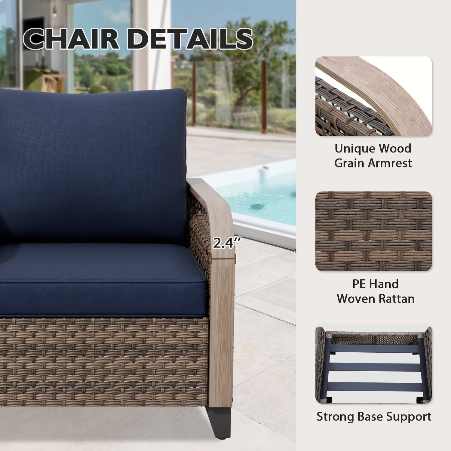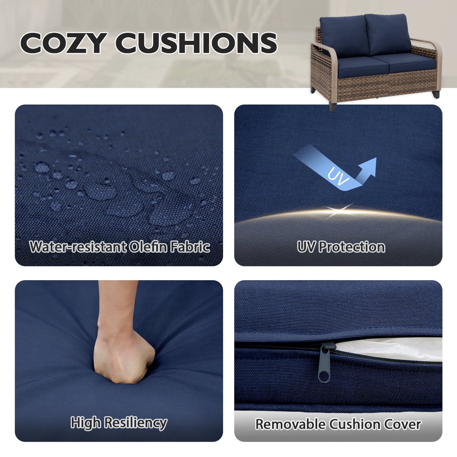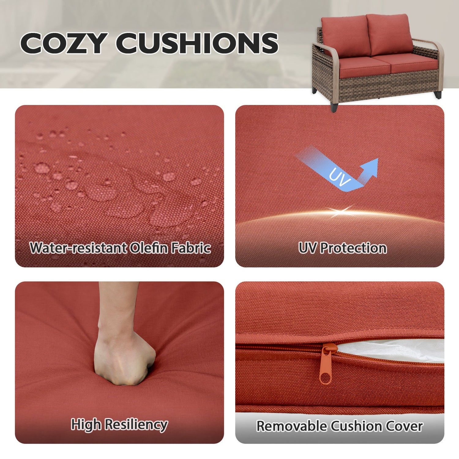 COZY SEATING: The cushion is made with premium olefin fabric and 100% polyester filling. Sink into deep and wide seat with 4 inch thick sponge-padded cushions for the ultimate patio seating experience. The 5 inch back cushion adds to great comfort level.