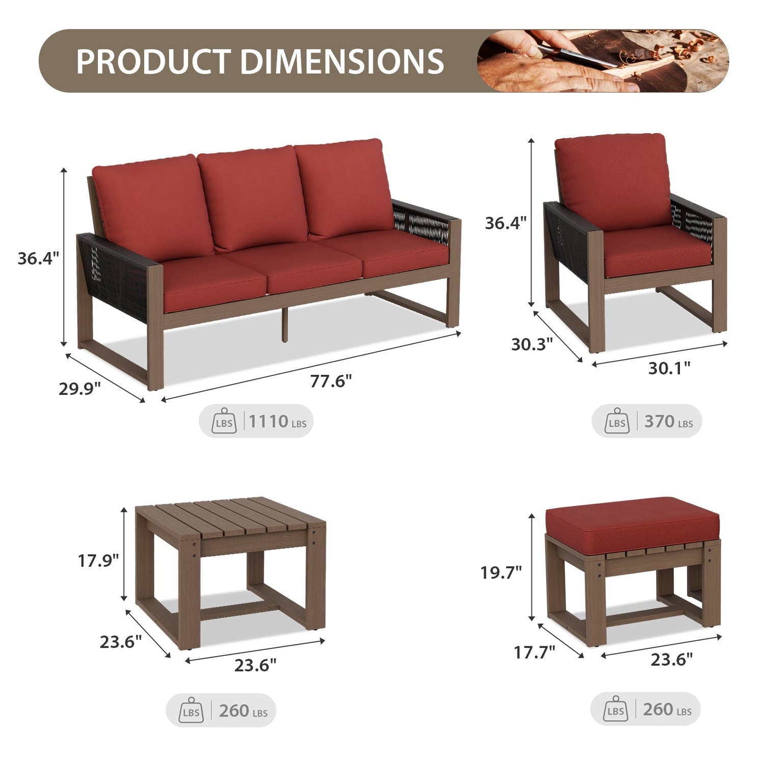 VERSATILE USE: This conversation set includes a 3 seat sofa, 2 patio chairs, 2 matching ottomans and a small sqaure side table. The real wood table is embossed to show the natural hues. It's outdoor weather resistant quality makes it ideal for patios, decks, porches, and poolside areas.