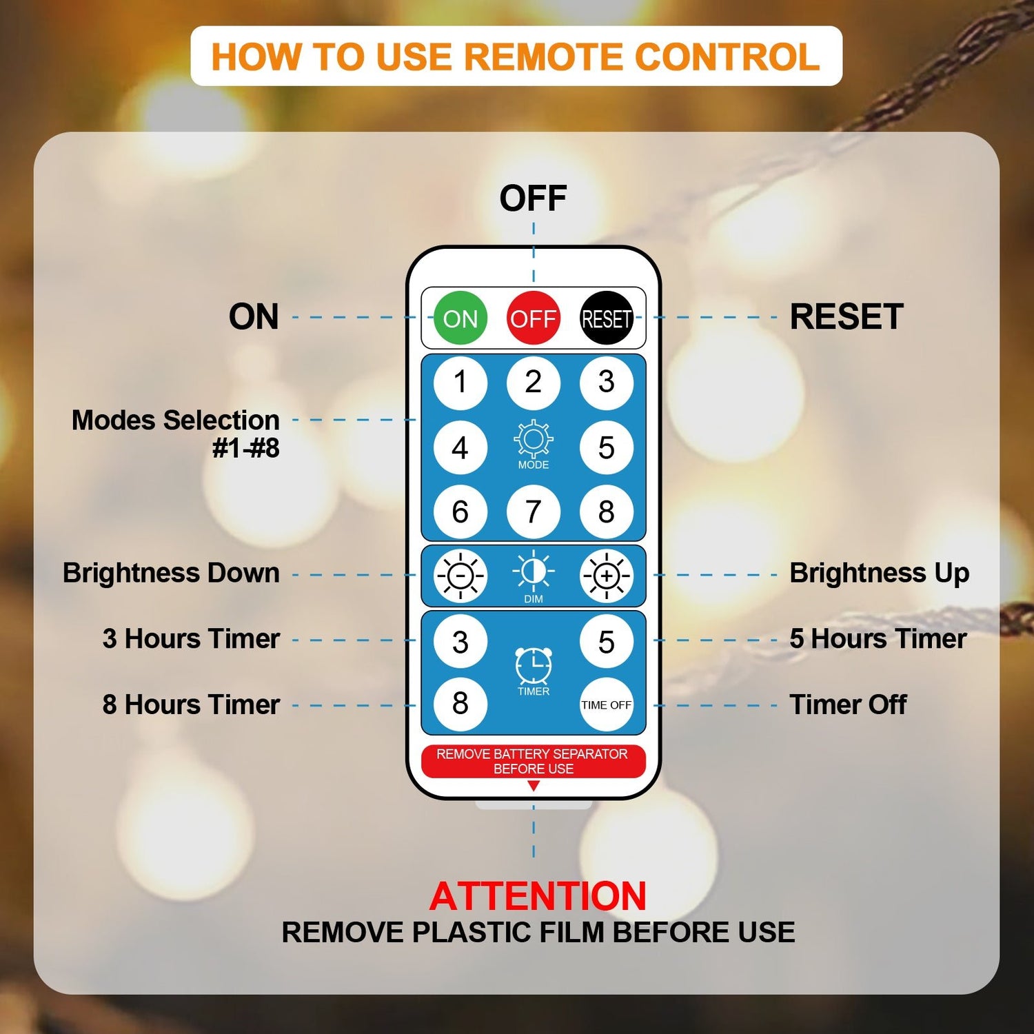 Remote Control with Timer Function: Featuring a user-friendly remote control, these lights allow you to easily turn them on/off, and adjust the brightness according to your preference. With the "TIMER" button, you can program the lights to turn on and off automatically based on a schedule of 6 hours on and 18 hours off.