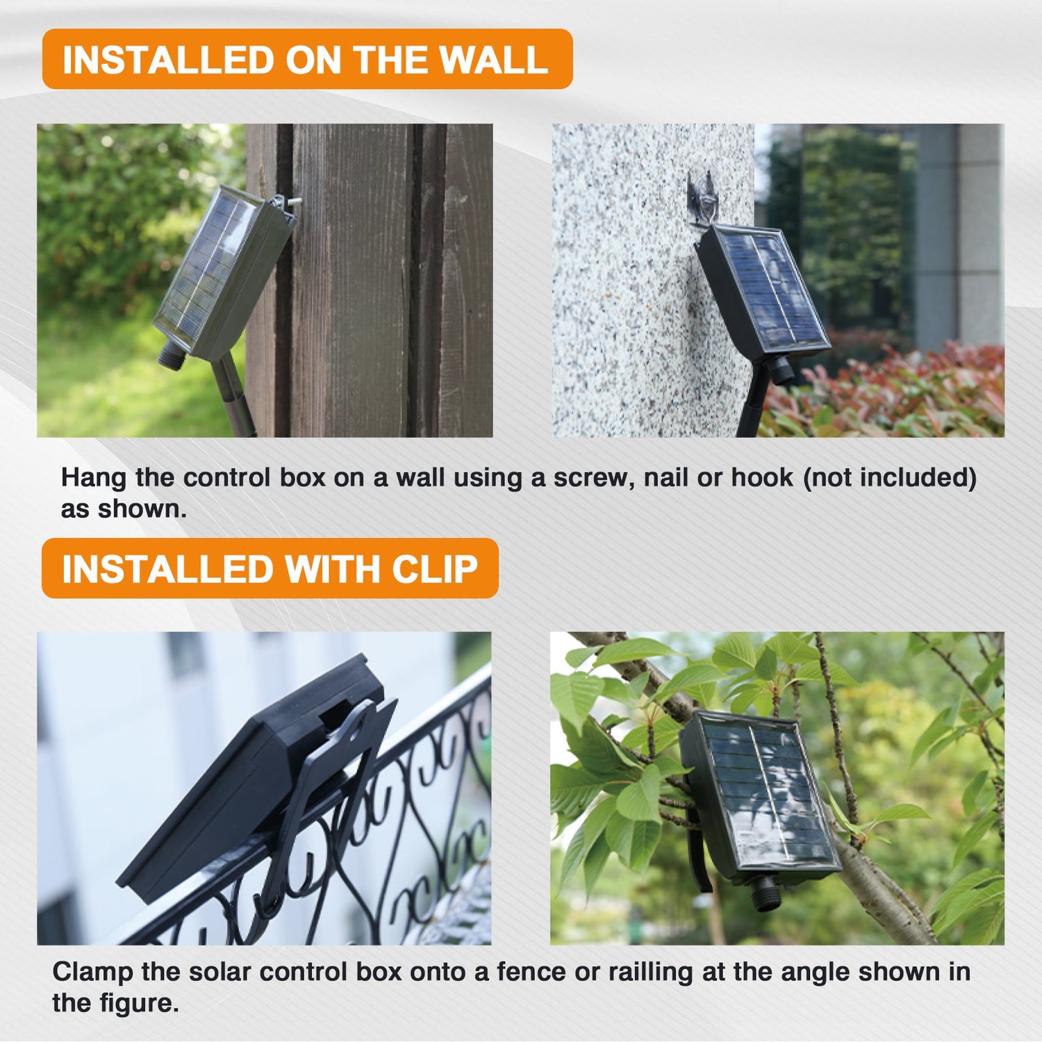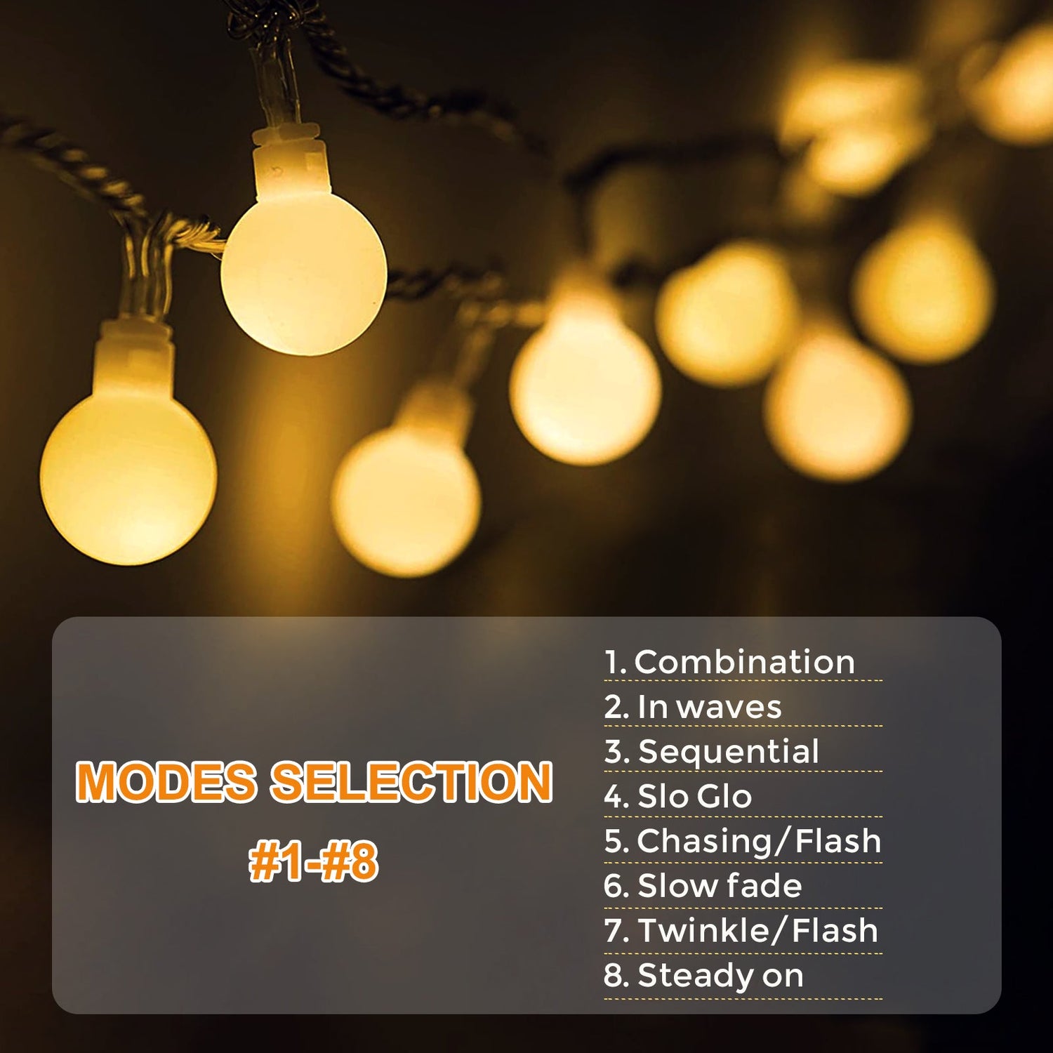 8-Mode Settings: These outdoor globe string lights have 8 different setting options available on the solar panel, including combinations like fireflies flashing, fading, chasing/flashing, twinkle/flashing, and steady on. With these settings, they can create different atmospheres for any occasion
