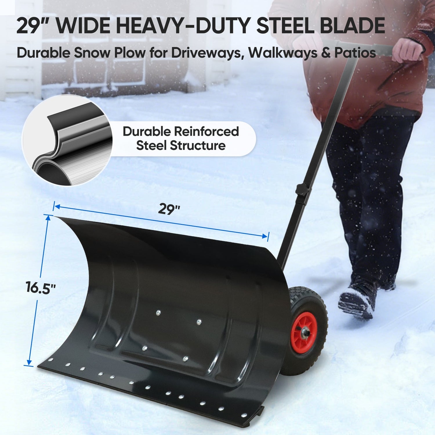 Wheeled Snow Shovel for Driveway 29”x16.5” Blade, Single/Dual Rod